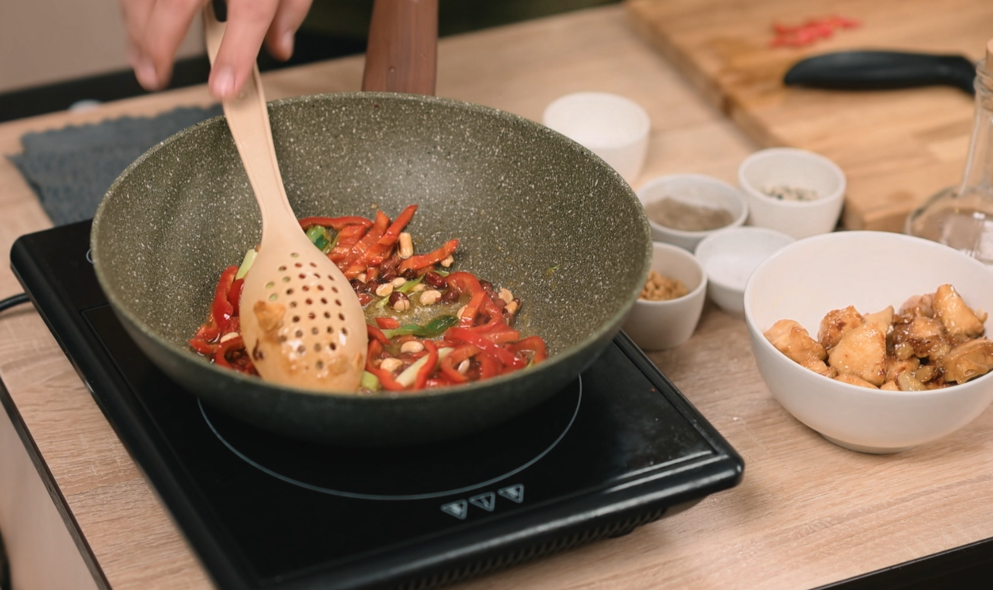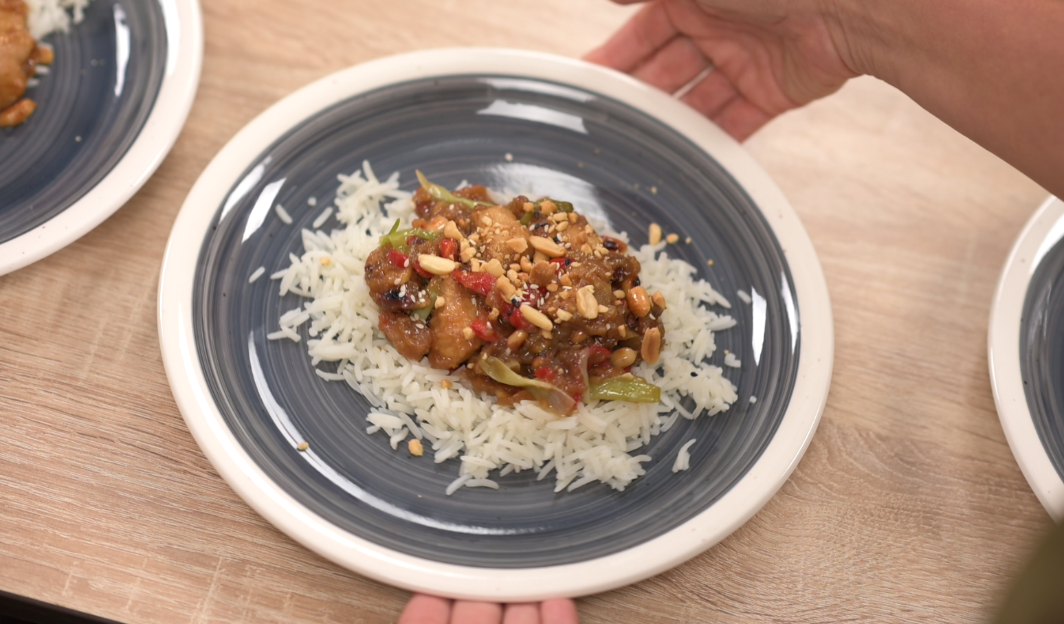 Сильно разогрейте в сковороде растительное масло и обжарьте кусочки курицы. В том же масле обжарьте перец чили, перец Рамиро, чеснок и имбирь. Добавьте к ним арахис, лук и куриное филе. Влейте вторую часть соево-уксусной смеси. Постоянно помешивая, дождитесь сгущения соуса. На отваренный рис выложите мясо с овощами и посыпьте молотым арахисом.